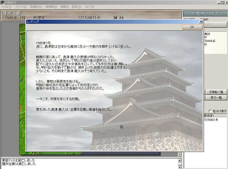 あとは本州統一と朝鮮半島統一へまっしぐら。そしてエンディングへ。