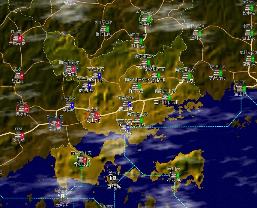 臣従していた主家(備前浦上家)から独立して、主家と不戦同盟を結んでいた新免家に従属。以後は亀山から、金川・徳倉・備中高松と攻略。イベントとしては信長が家名を継いだり、大内家が陶家に吸収されたりしましたね。