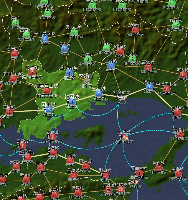 あと、気になったのは細川吉兆家の四国でしょうか。上のマップにみるように軍船を建造せずに六万程度の兵が右往左往してました。これが軍船移動を抑制した結果ならしょうがない部分ですが。