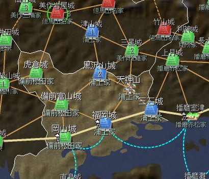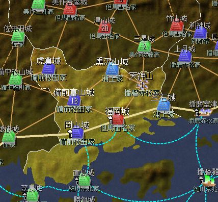 次は、播磨赤松家とは同盟関係の尾州畠山家に独立後、即従属化。弱小大名へのチートイベントに助けられつつ兵力を整え但馬山名家の(備前)福岡城を攻める。厭戦イベントで撤退を繰り返しつつも占領。城兵50に対して攻城500でも苦戦。半年ぐらい攻めて、成果10が計略という落ちが。津山城では、その反省から城兵20に対しても攻城20で釣り出しを慣行。占領時は、城兵0に対して攻城も0。